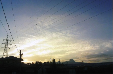 遠くに浅間山が見え、その上空から真上にかけて段々状の雲全てが輝いている