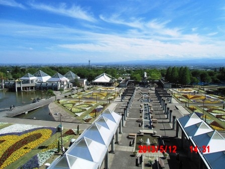 <馬事公苑付近から見た前橋の街並みと秩父連山、その奥はアルプス>