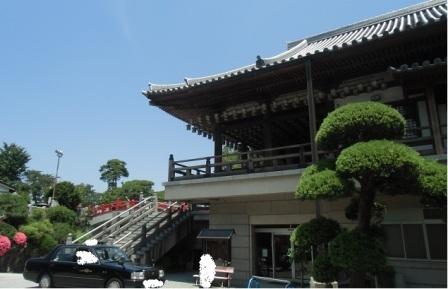 <駐車場から見た本堂>山なので斜面の上にある