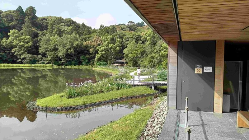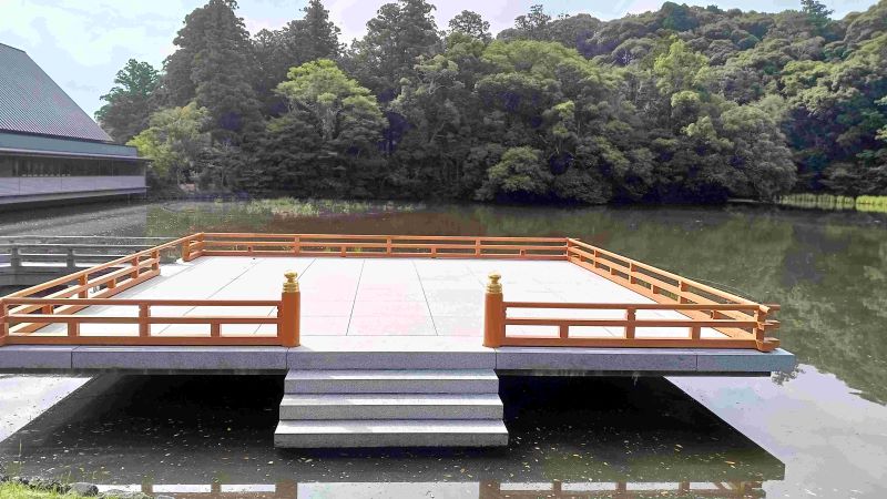<池に浮く舞台、おそらく神様に奉納する舞を舞うのだろう>